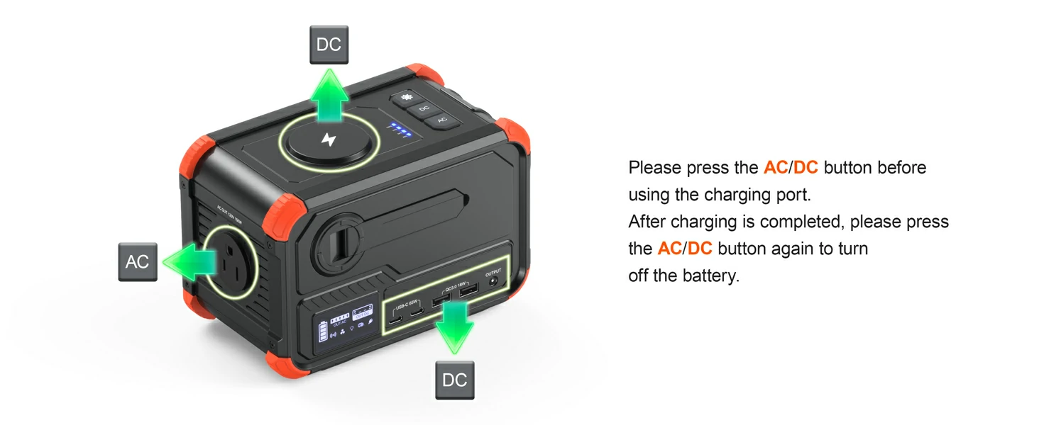 USB-C, USB-A, Wireless Charger, AC Outlet, DC Port