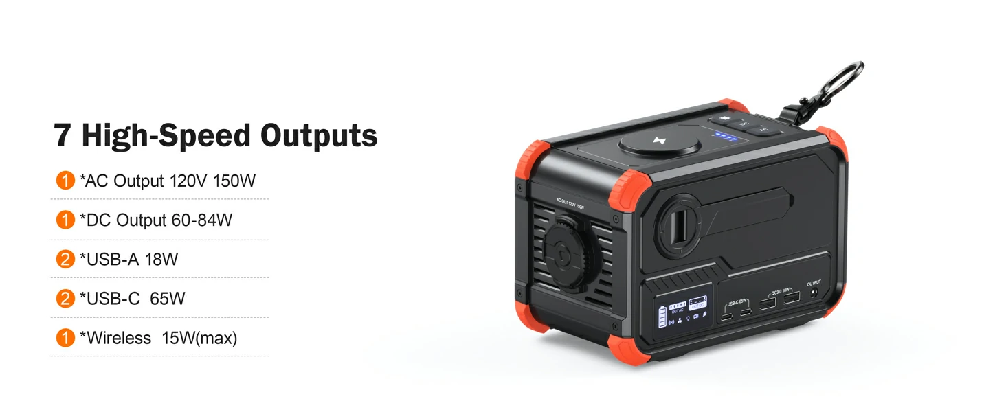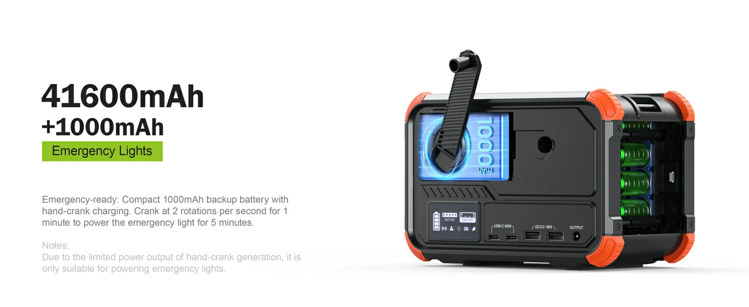 Portable 150Wh Emergency Power Station PD65W Fast Charge LED Wireless Charging Hand Crank MPPT Pure Sine Wave US Plug