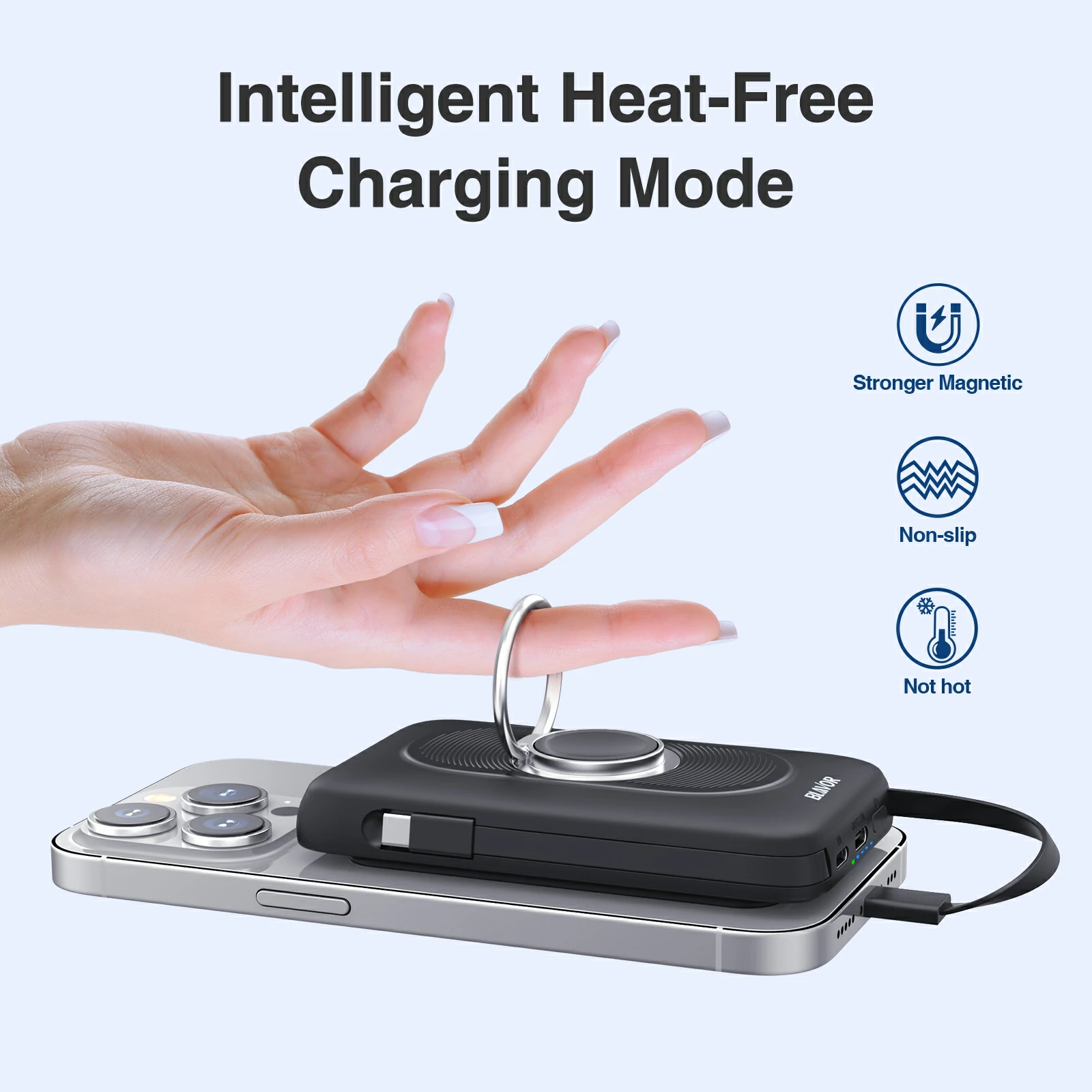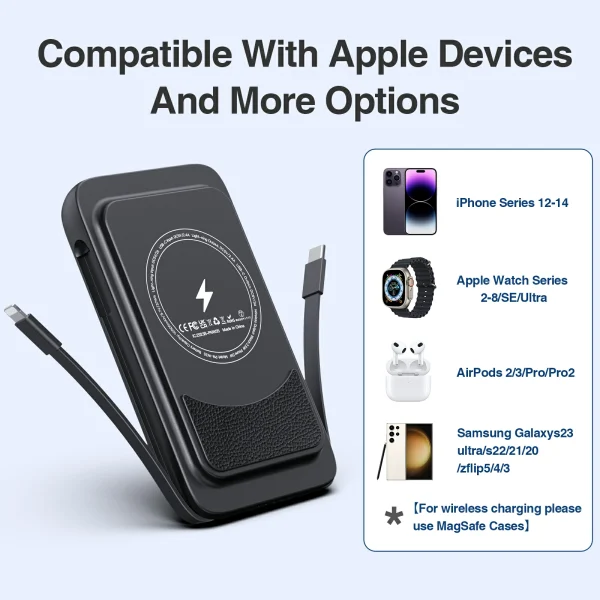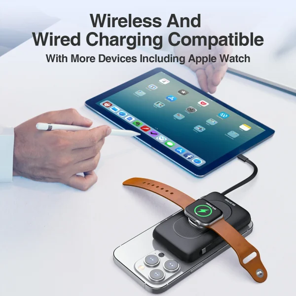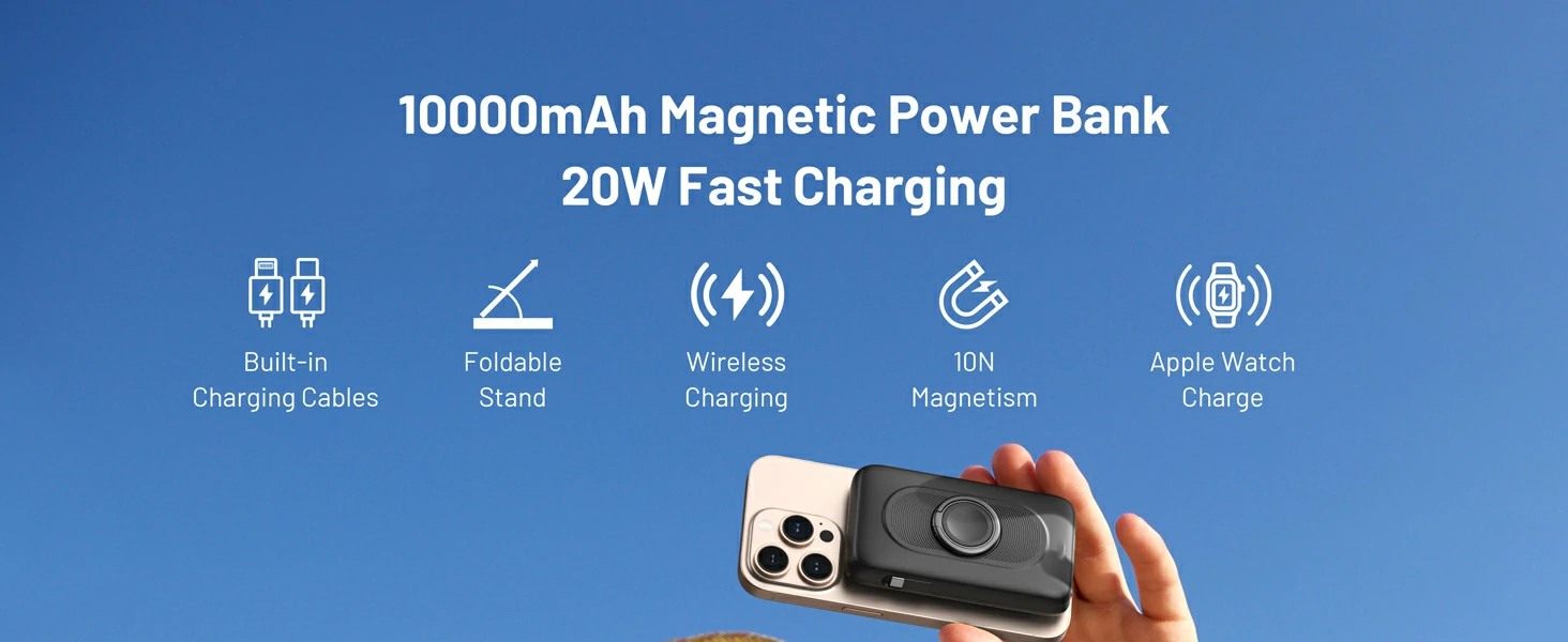 10,000mAh Portable Power Bank Magnetic Wireless Charger for Phone and Watch Built-in Cables USB-C PD20W Fast Charging for Daily Use