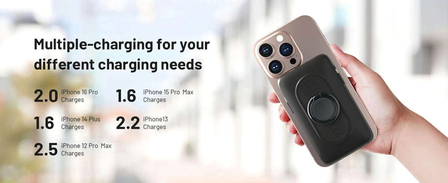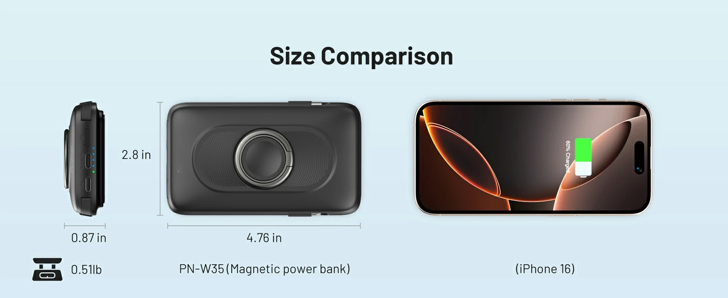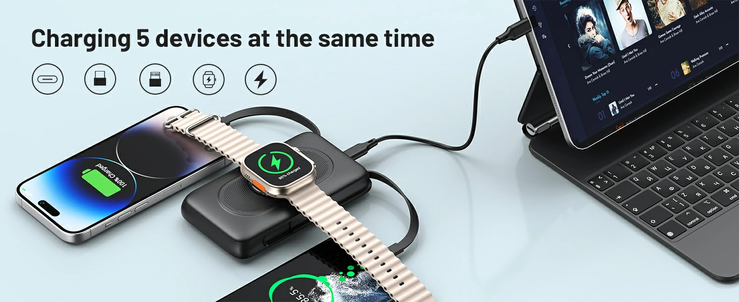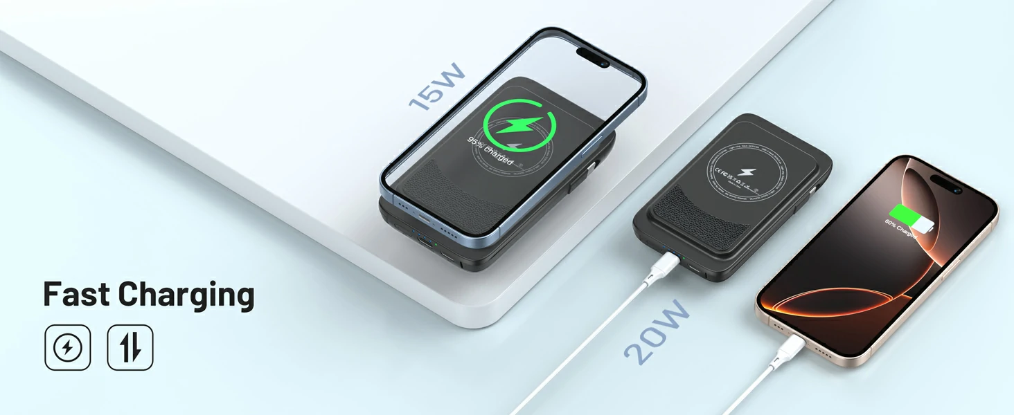 10,000mAh Portable Power Bank Magnetic Wireless Charger for Phone and Watch Built-in Cables USB-C PD20W Fast Charging for Daily Use