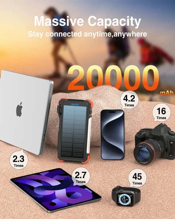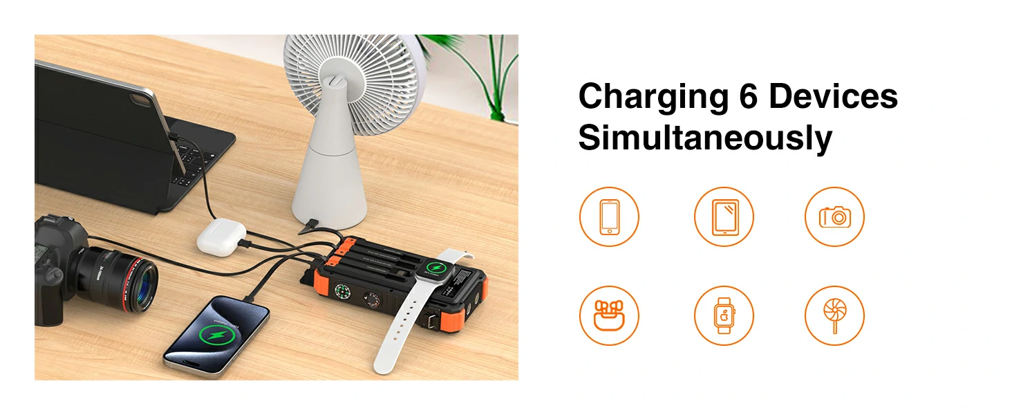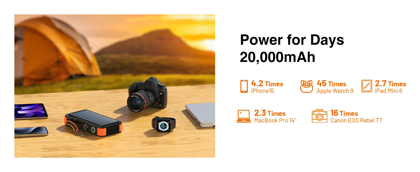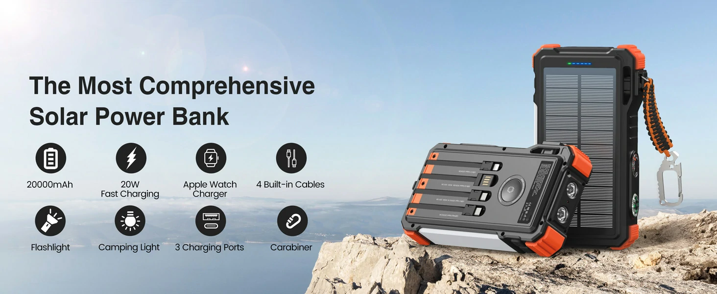 20,000mAh Solar Power Bank PD20W Fast Charging with Wireless Charger for Watch Emergency LED Camping Light Outdoor