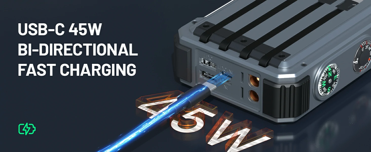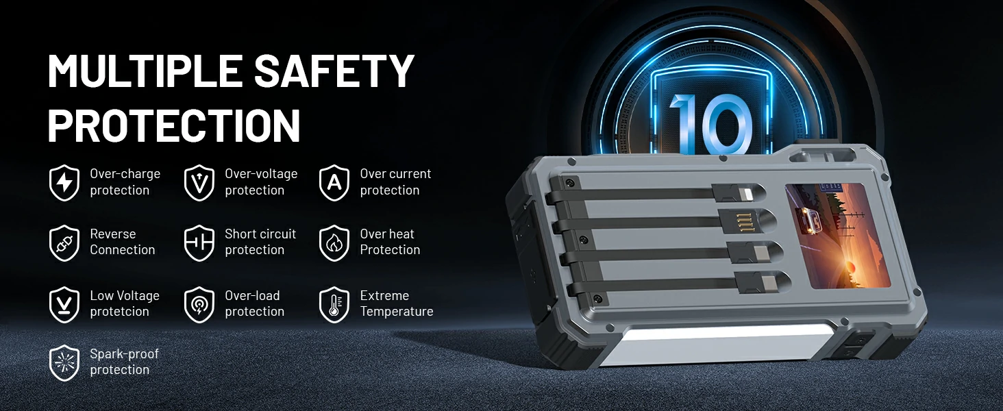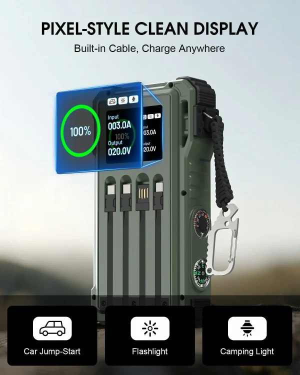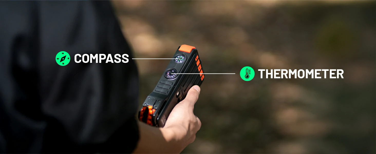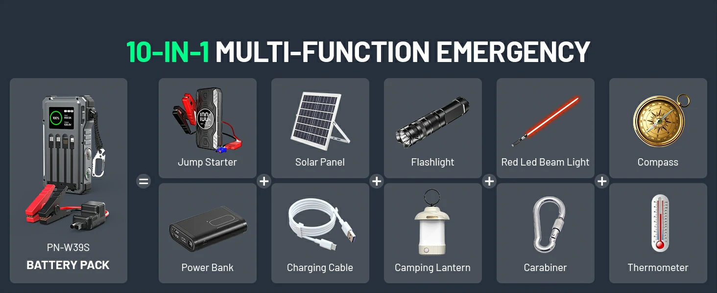 LCD Display, Compass, Thermometer, LED Light, Camping Light, Laser Light, Car Jump Starter