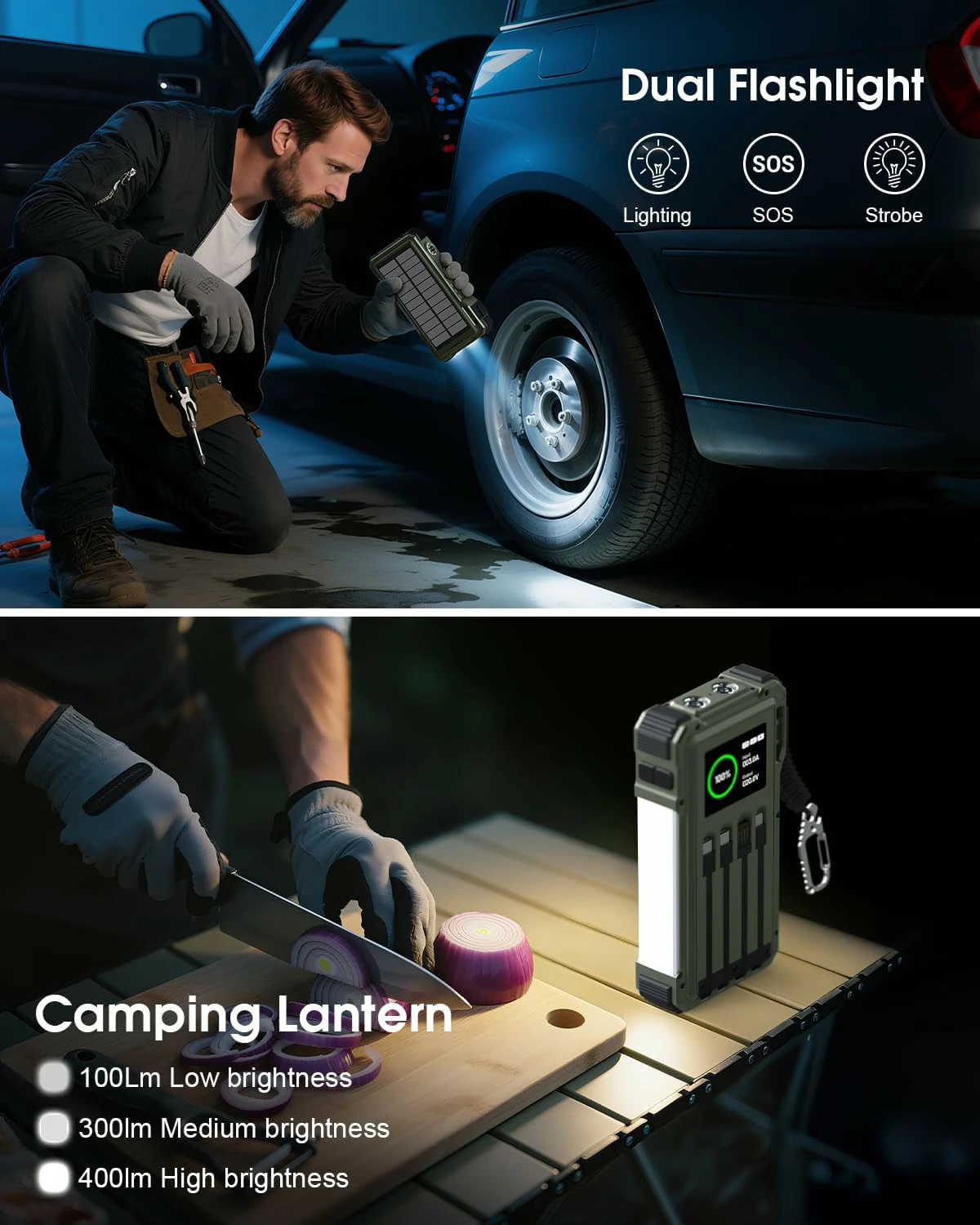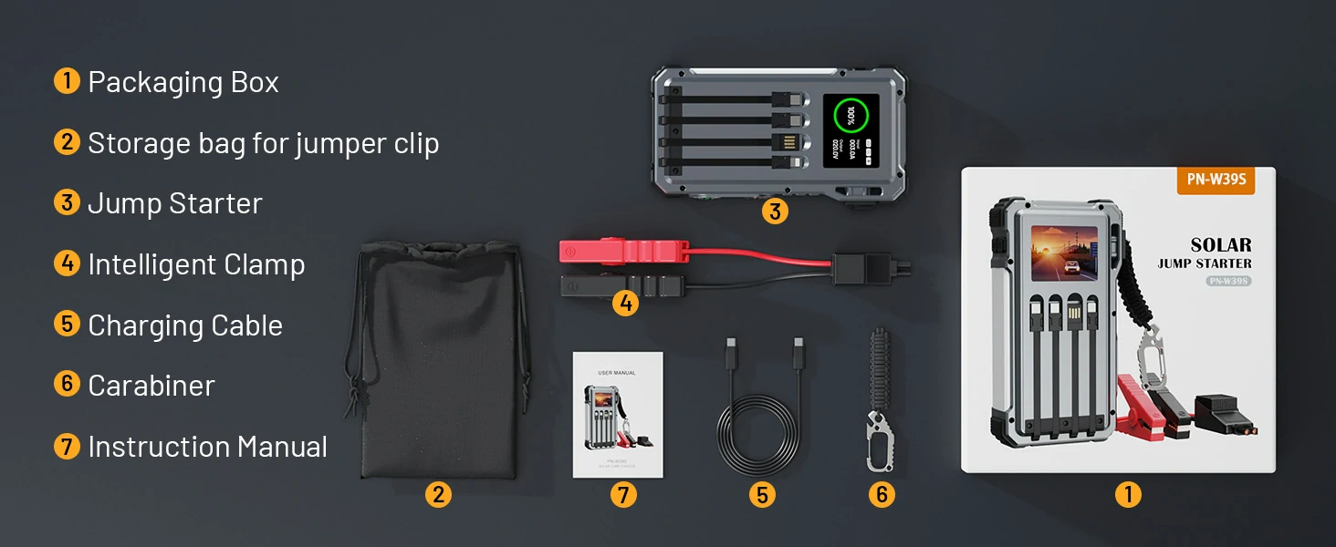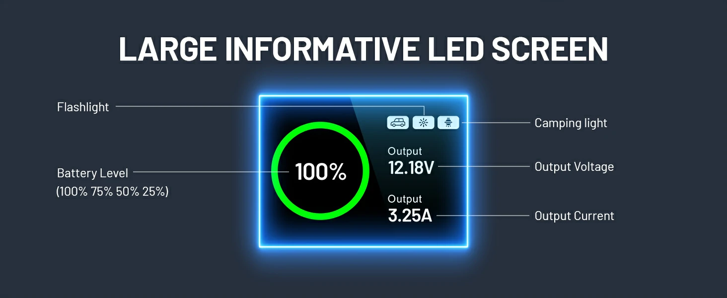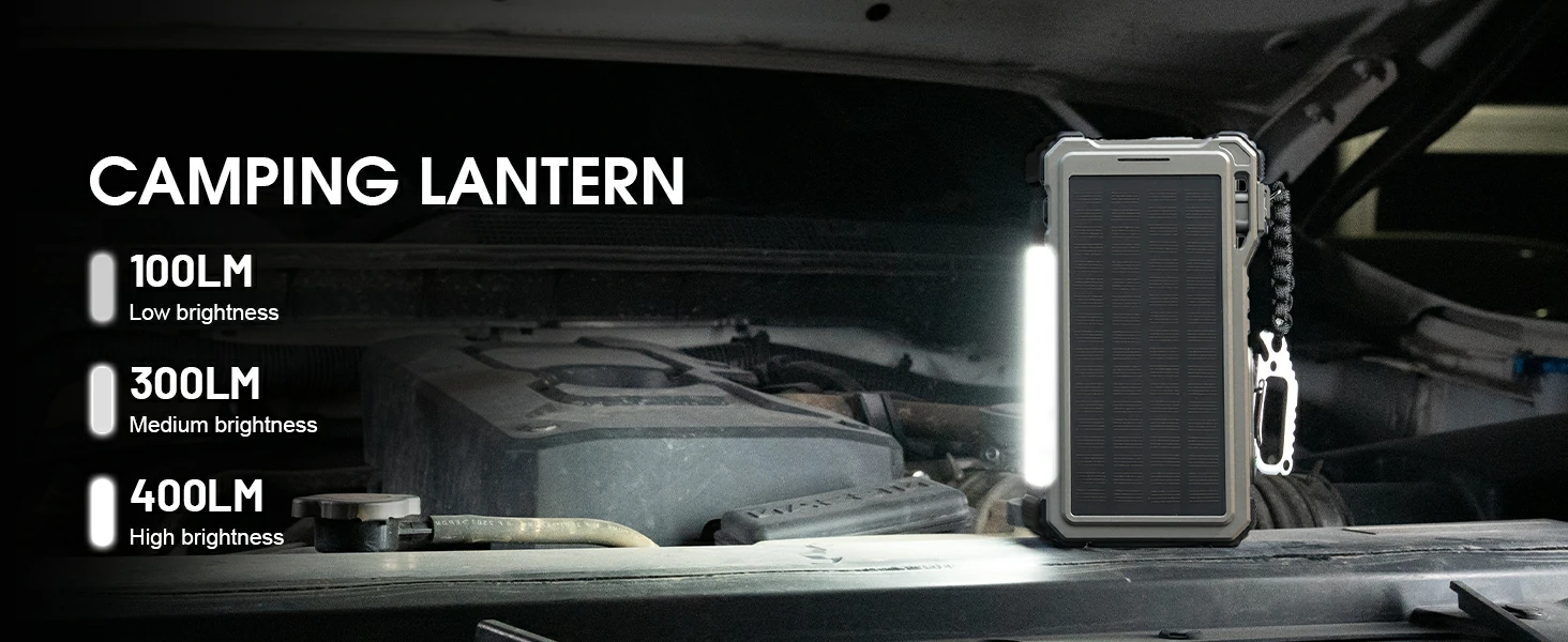 LCD Display, Compass, Thermometer, LED Light, Camping Light, Laser Light, Car Jump Starter