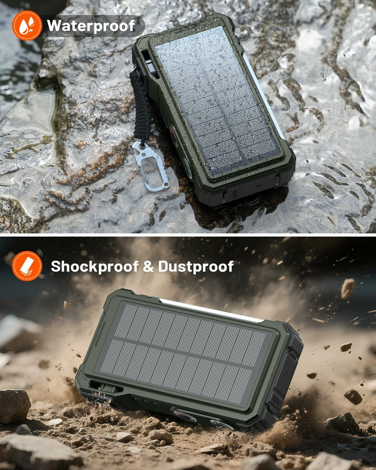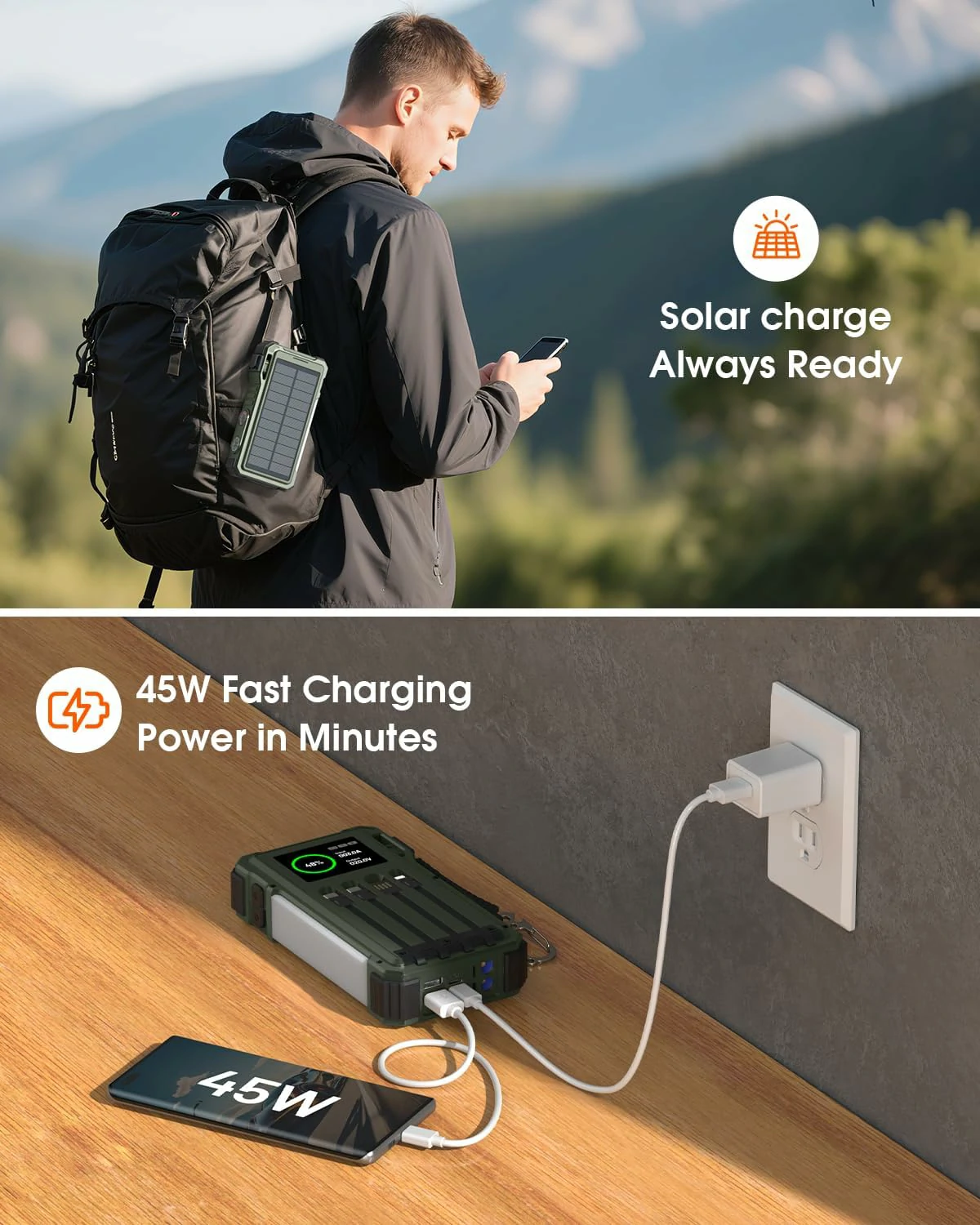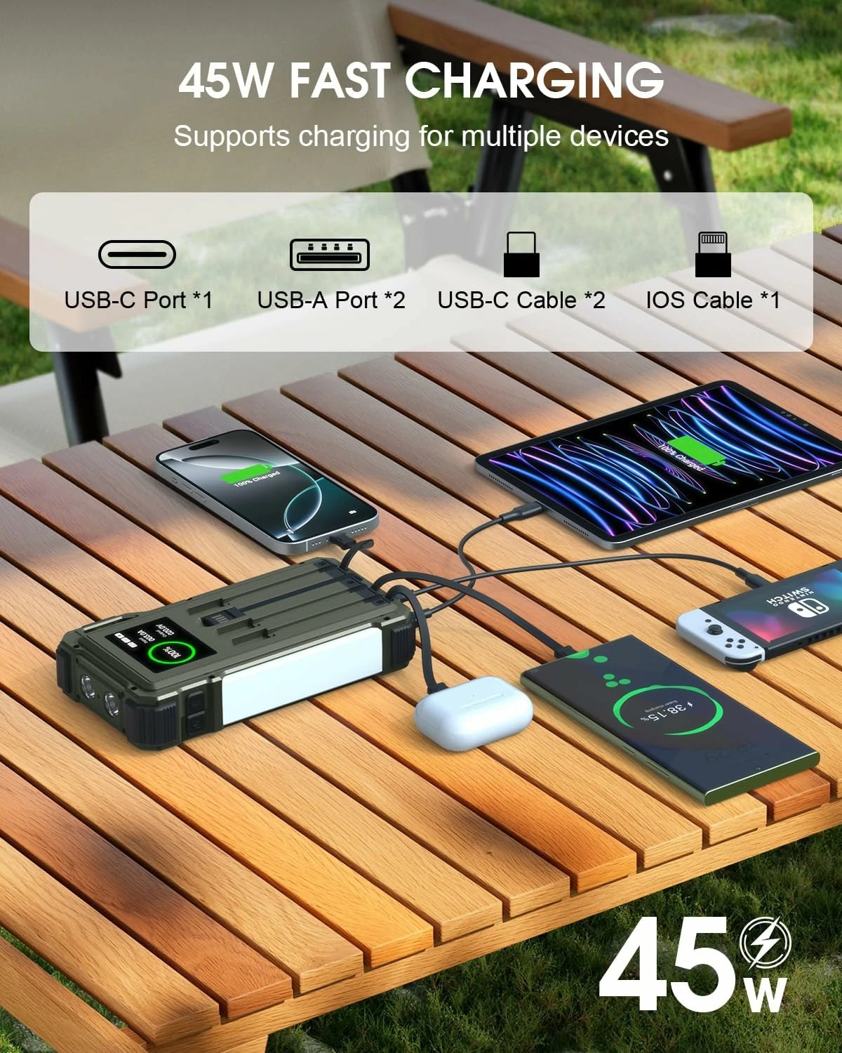 USB-A, USB-C, Lightning, Solar Panel